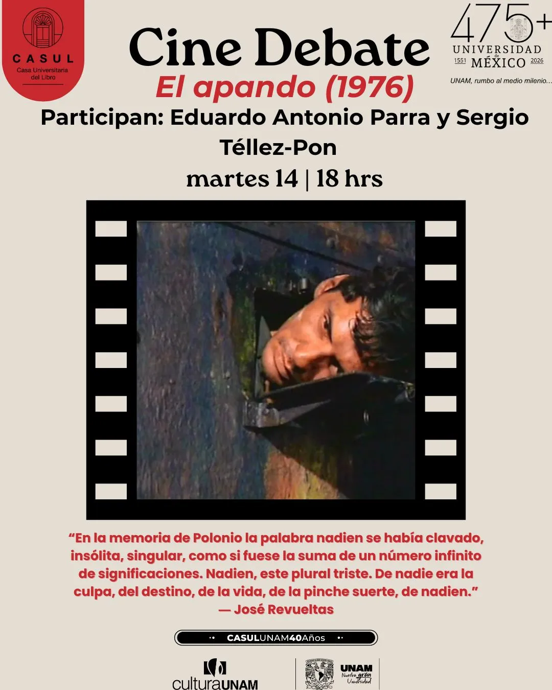 • En la Casa Universitaria del Libro (CASUL) se llevará a cabo una actividad dedicada a El apando —escrita en Lecumberri— junto con el análisis de su adaptación cinematográfica dirigida por Felipe Cazals.