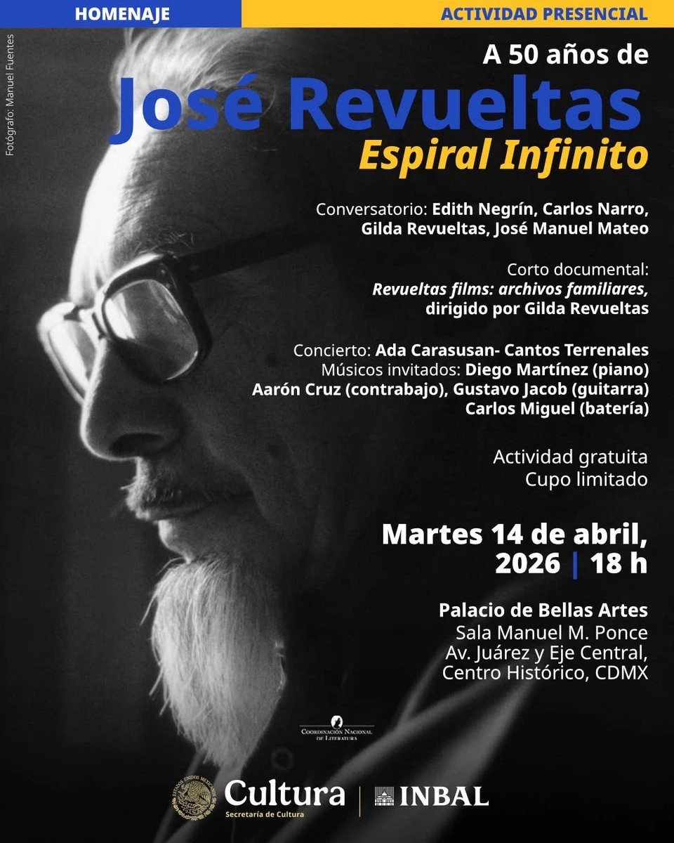 • A las 18:00 horas, la Sala Manuel M. Ponce del Palacio de Bellas Artes será sede del encuentro “A 50 años de José Revueltas. Espiral infinito”, organizado por el Instituto Nacional de Bellas Artes y Literatura. La jornada incluye la proyección del documental Revueltas films: archivos familiares, dirigido por Gilda Revueltas, un conversatorio con especialistas y una presentación musical a cargo de Ada Carasusan y ensamble.