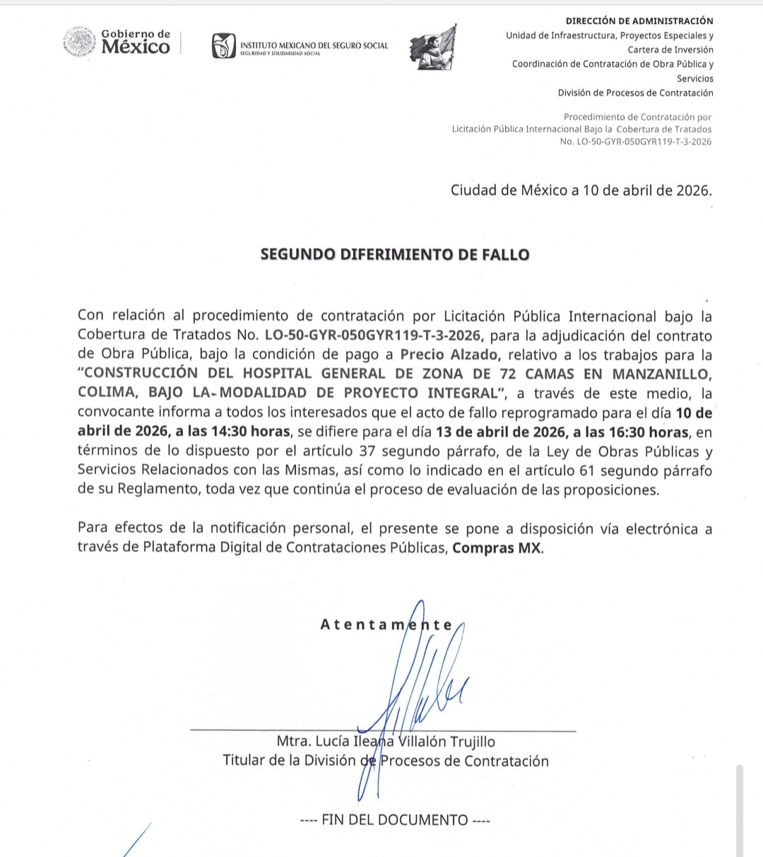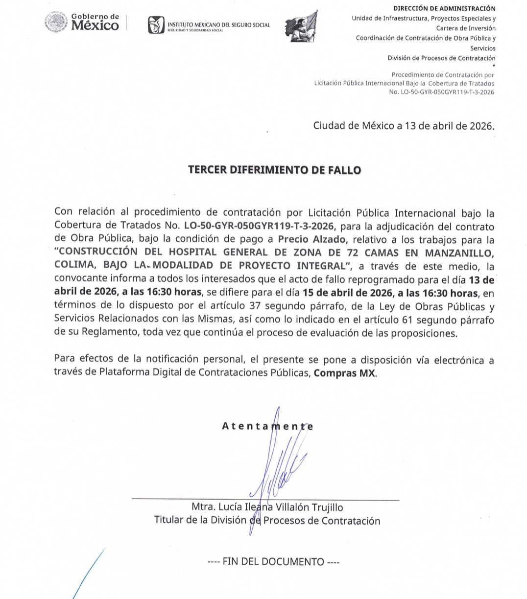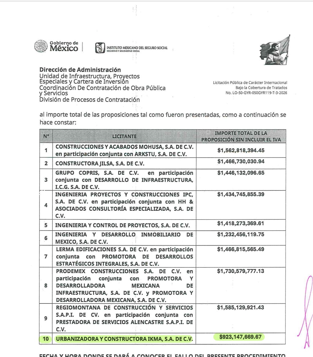 Con base en documentos a los que tuvo acceso La Aurora de México, dijeron que en marzo pasado se llevó a cabo la presentación y apertura de proposiciones de la licitación pública de carácter internacional número LO-50-GYR-050GYR119-T-3-2026 relacionada con la edificación de dicho hospital, bajo la modalidad de proyecto integral.