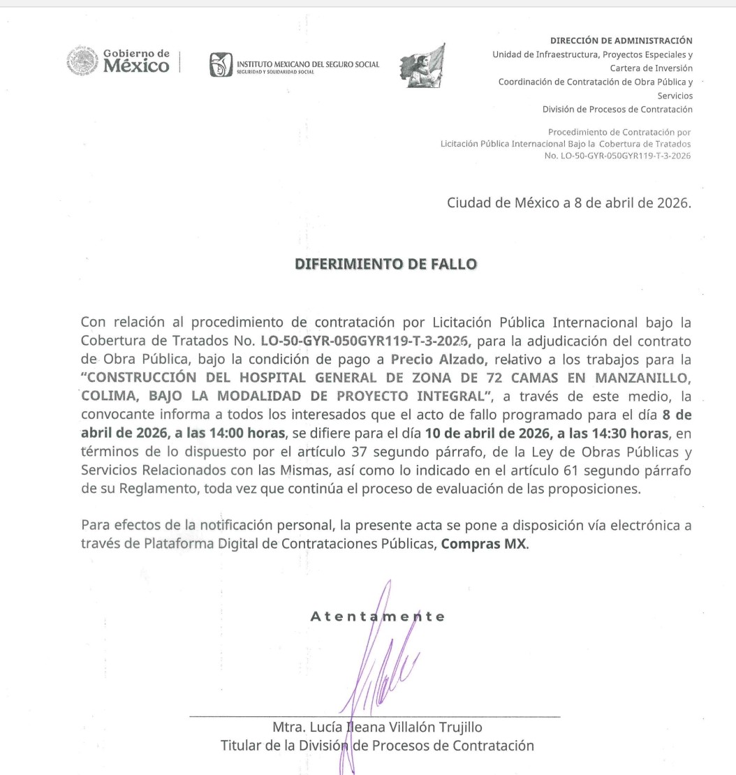 Empresas que presentaron proyectos económicos para la construcción del Hospital General de Zona en Manzanillo, Colima, con capacidad de 72 camas, advirtieron una serie de retrasos en el proceso de asignación del contrato por parte del IMSS, el cual podría culminar con un daño al erario por 495 millones de pesos.