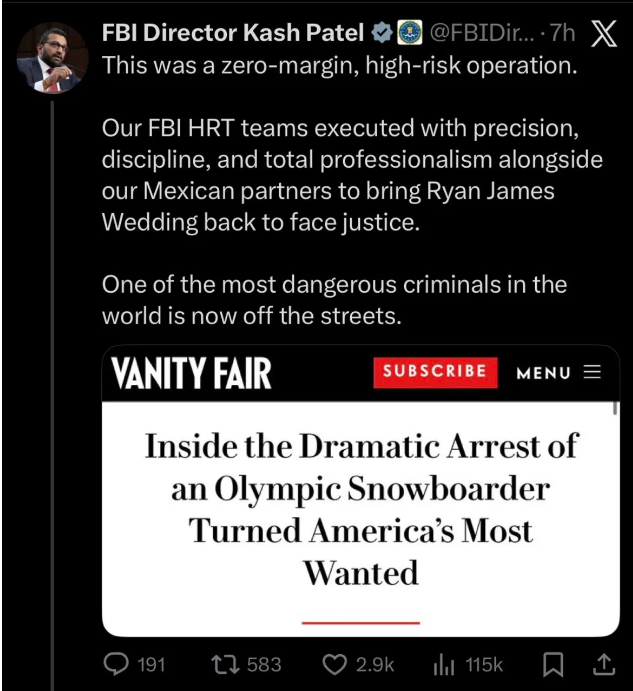 Kash Patel, director del FBI, publicó en su cuenta de X un extracto de Vanity Fair que hace esta revelación