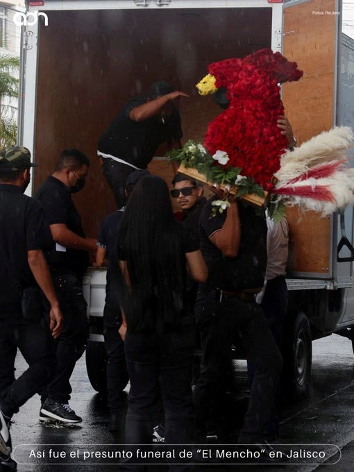 Bajo las notas de “Nomás un puño de tierra”, una carroza fúnebre de modelo reciente, camionetas de lujo, más de un centenar de coronas y arreglos florales, un amplio dispositivo de seguridad integrado por elementos del Ejército, la Guardia Nacional y la policía estatal, decenas de deudos con el rostro completamente cubierto y un féretro dorado que finalmente llegó al panteón Recinto de la Paz, en Zapopan, así transcurrieron los funerales de Nemesio Oseguera Cervantes, “El Mencho”.