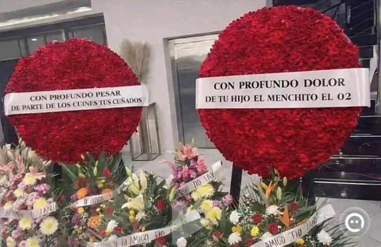 Uno de los elementos más llamativos fue la llegada constante de coronas, muchas de ellas sin remitente. Medios locales contabilizaron al menos 15 arreglos sin cintillo de identificación, además de otros con mensajes genéricos de agradecimiento; dos provenían de familiares cercanos, entre ellos su hijo, "El Menchito" y su cuñado, "El Cuini".