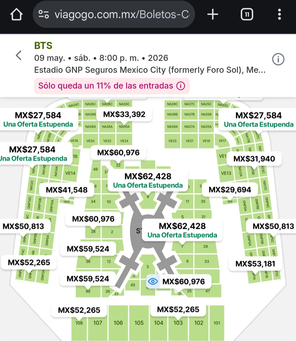 La reventa en páginas oficiales como StubHub y ViaGogo, los precios van desde los 100 mil hasta los 130 mil pesos.