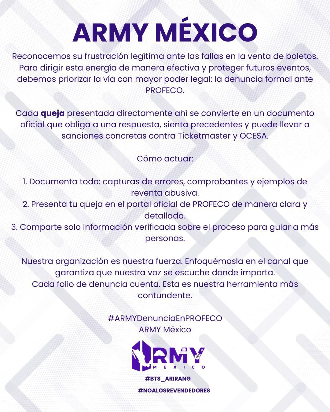 La inconformidad escaló cuando comenzaron a circular imágenes de personas formadas afuera de Ticketmaster en el Palacio de los Deportes, presuntamente revendedores, a pesar de que la preventa estaba limitada exclusivamente a usuarios con membresía ARMY activa. Este club de fans organizó una denuncia colectiva, difundida en redes sociales, en la que exigieron la intervención inmediata de la Profeco, la cancelación de boletos adquiridos de manera irregular, sanciones por los precios dinámicos y mayor supervisión en taquillas.
