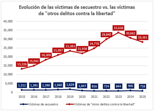Sin embargo, la línea roja, correspondiente a la categoría de “otros delitos contra la libertad”, cuenta una historia distinta: una que, incluso considerando la cifra oculta, se mide en decenas de miles de víctimas. Si en 2015 el número de registros en esta categoría fue aproximadamente 10 veces mayor que el total de víctimas de secuestro, para 2022 esa proporción ya había escalado a más de 40 veces, nivel que se mantiene de manera aproximada en los años posteriores: cerca de 40 veces en 2023 y 2025, y alrededor de 34 veces en 2024.
