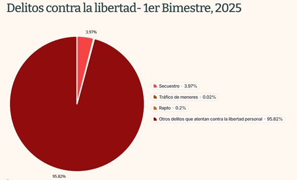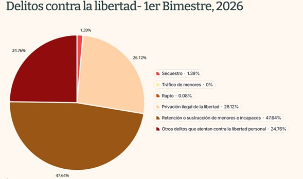 A la luz de estos datos, la distribución proporcional de los delitos contra la libertad personal también presenta cambios significativos. Como se observa en las gráficas, el secuestro reduce su peso relativo dentro del total, al pasar de representar el 3.97% en 2025 a 1.39% en 2026. No obstante, más que una disminución general del fenómeno, los datos sugieren ajustes en cómo se registran y distribuyen los delitos que atentan contra la libertad personal.