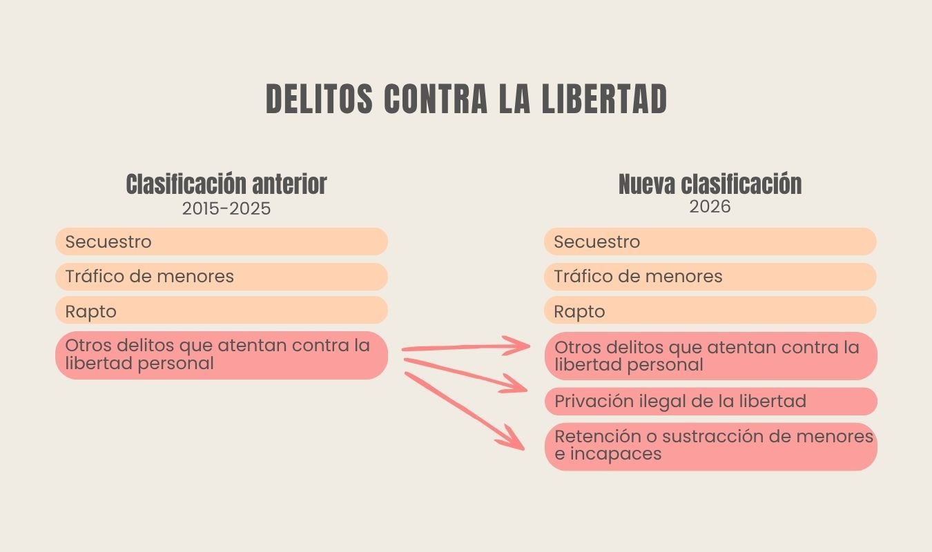 Por lo tanto, además de que ahora las tentativas son sumadas a conductas consumadas, la permanencia de otras clasificaciones mantiene un margen amplio para la discrecionalidad. La siguiente ilustración muestra la diferencia entre los criterios de desagregación de los delitos contra la libertad antes y después de 2026.