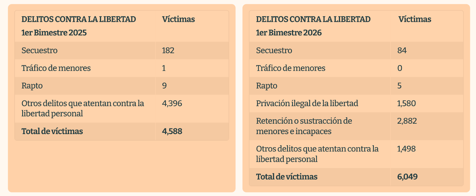En términos absolutos, el total de víctimas en estas categorías aumenta, al pasar de 4,588 en enero y febrero de 2025 a 6,049 en enero y febrero de 2026. Mientras tanto, el número de víctimas de secuestro pasa de 182 a 84 casos.