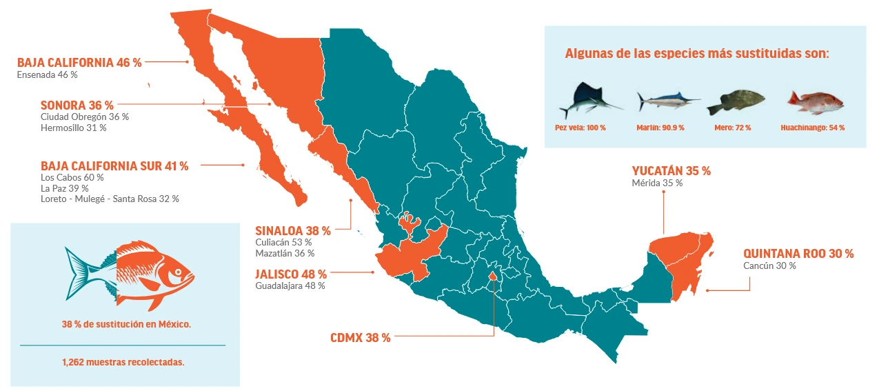 Entre las especies más sustituidas destaca el pez vela (100%), marlin (91%), sierra (82%), pez loro (68%) y huachinango (54%).