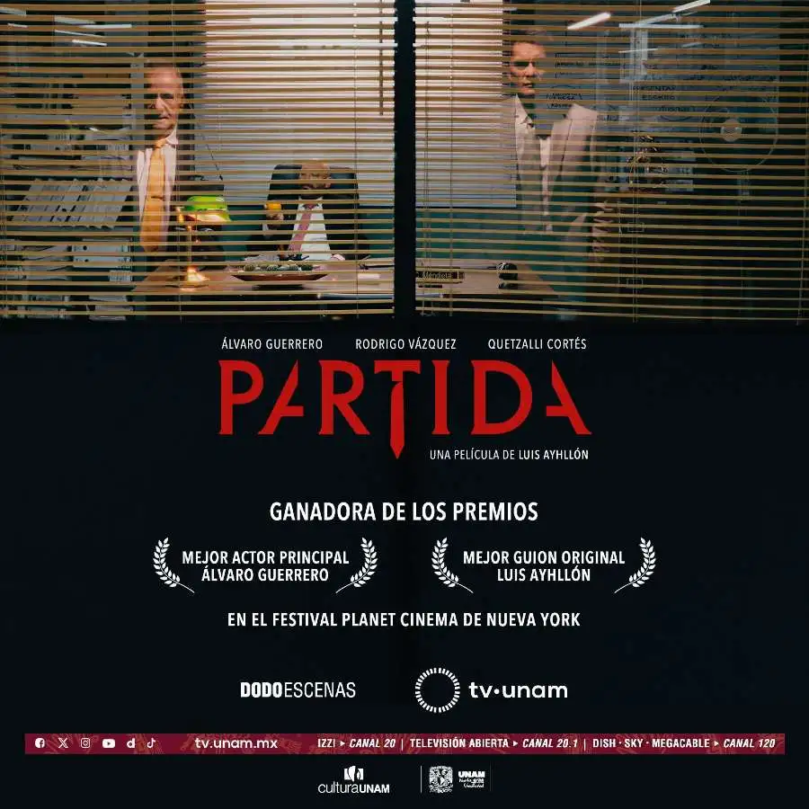 Partida es una película que fue filmada íntegramente en las instalaciones de TV UNAM y cuenta con las actuaciones de Álvaro Guerrero, Rodrigo Vázquez y Quetzalli Cortés. Su historia se desarrolla en una oficina de abogados donde un jefe somete a sus empleados a un juego de control y manipulación que pone en evidencia prácticas de explotación laboral, dinámicas de poder y códigos machistas aún vigentes en distintos entornos profesionales.