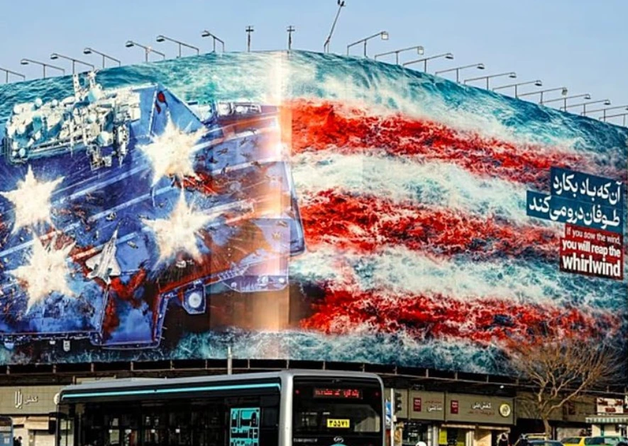 El mural exhibido coincide con la movilización militar de Estados Unidos hacia aguas cercanas a Irán.