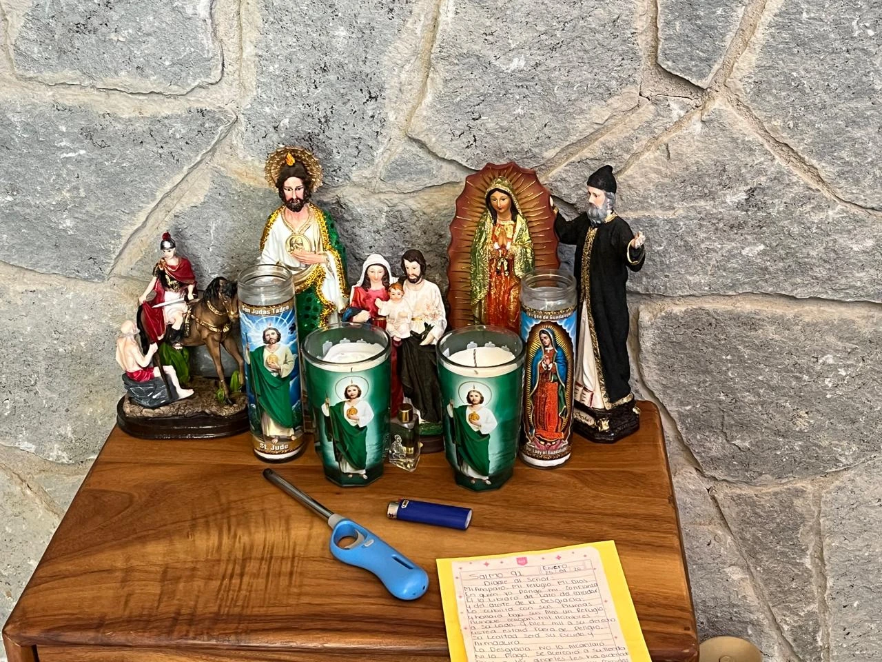 Durante el operativo del domingo -que derivó en su captura y muerte-, en su última guarida, el exclusivo fraccionamiento Tapalpa Country Club, se hallaron imágenes de la Virgen de Guadalupe, San Charbel, San Miguel y San Judas Tadeo. Así como veladoras que no alcanzó a encender ese día, como lo demuestran mecheros que quedaron encima de un mueble.