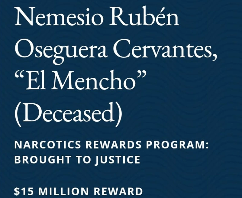 El Departamento de Estado retiró así de manera oficial la recompensa de 15 millones de dólares que ofrecía por el líder del Cártel Jalisco Nueva Generación (CJNG), cuya eliminación se atribuyó -sin mencionarlo por su nombre- el presidente Donald Trump en su discurso del Estado de la Unión.