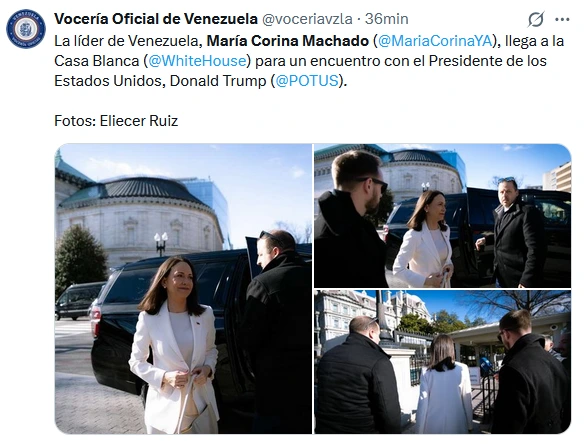 El encuentro entre Machado y Trump se realiza un día después de que el republicano y la presidenta interina de Venezuela, Delcy Rodríguez, mantuvieran una conversación telefónica en la que abordaron temas como petróleo, comercio y seguridad.
