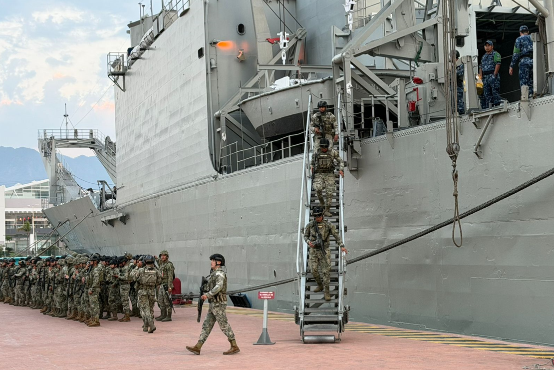 A bordo del A-412 llegaron 103 elementos de Infantería de Marina y vehículos tipo pickup, que refuerzan la vigilancia y seguridad, luego de los hechos violentos cometidos por sicarios del CJNG.