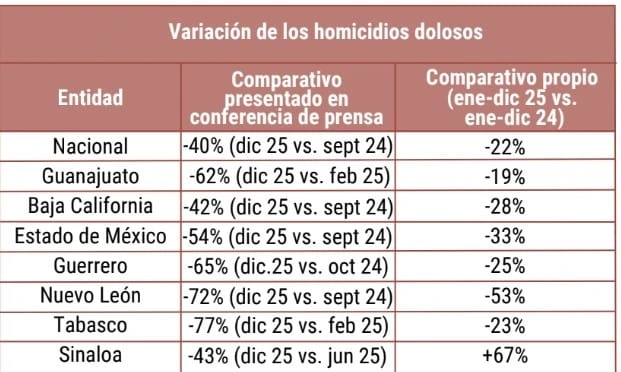 Causa en Común sostiene que los comparativos engañosos son utilizados para pregonar decrementos, como ocurrió en la conferencia de prensa del 8 de enero de 2026, en la que se destacaron “notables reducciones” de homicidios doloso a nivel nacional, así como en Guanajuato, Baja California, Estado de México, Guerrero, Nuevo León, Tabasco y Sinaloa.