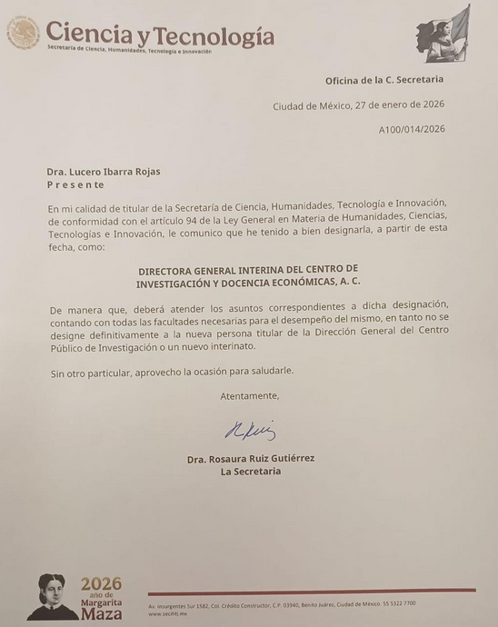 La secretaria de Ciencia, Humanidades, Tecnología e Innovación (Secihti), Rosaura Ruiz Gutiérrez, destituyó a José Antonio Romero Tellaeche del Centro de Investigación y Docencia Económicas (CIDE), quien será sustituido por Lucero Ibarra Rojas.