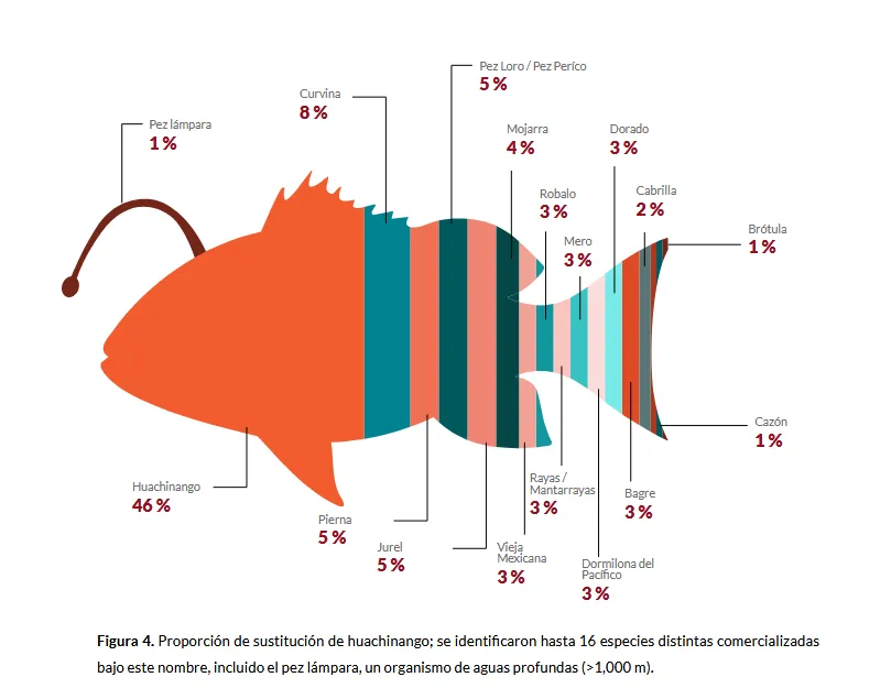 Entre las especies más sustituidas destaca el pez vela (100%), marlin (91%), sierra (82%), pez loro (68%) y huachinango (54%).