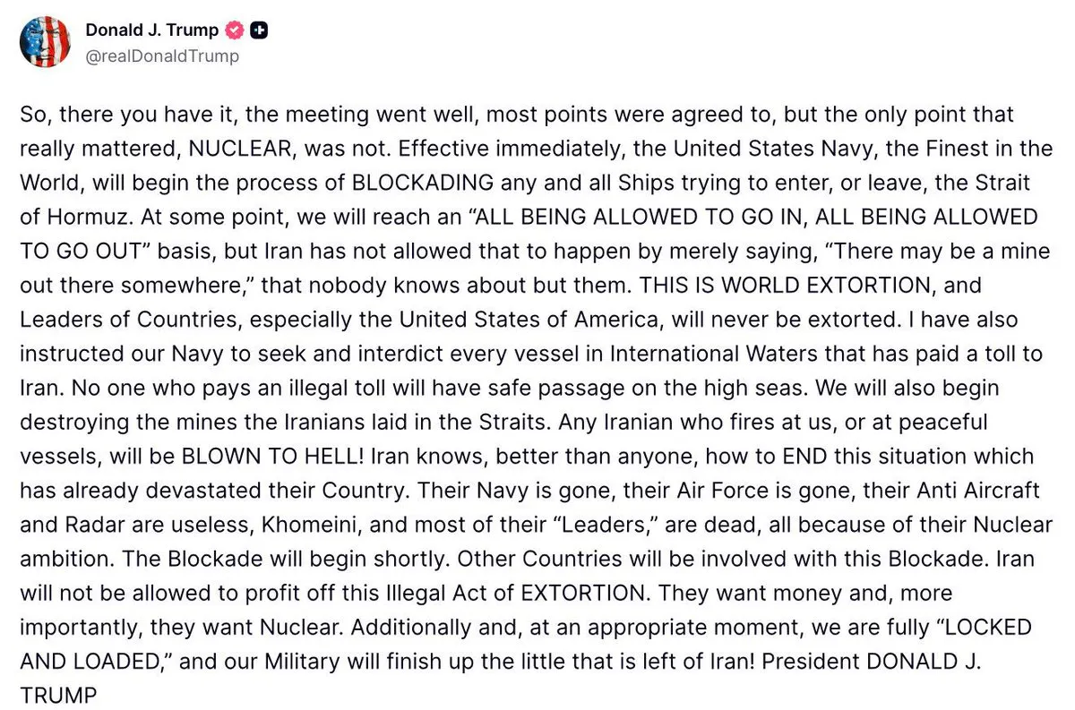 En un mensaje difundido en su red social, el presidente de Estados Unidos, Donald Trump, señaló que, tras una reunión reciente entre los negociadores de EU y Teherán, “la mayoría de los puntos fueron acordados, pero el único punto que realmente importaba, el nuclear, no lo fue”. A partir de ello, informó que “de manera inmediata, la Marina de Estados Unidos iniciará el proceso de bloquear cualquier barco que intente entrar o salir del Estrecho de Ormuz”.